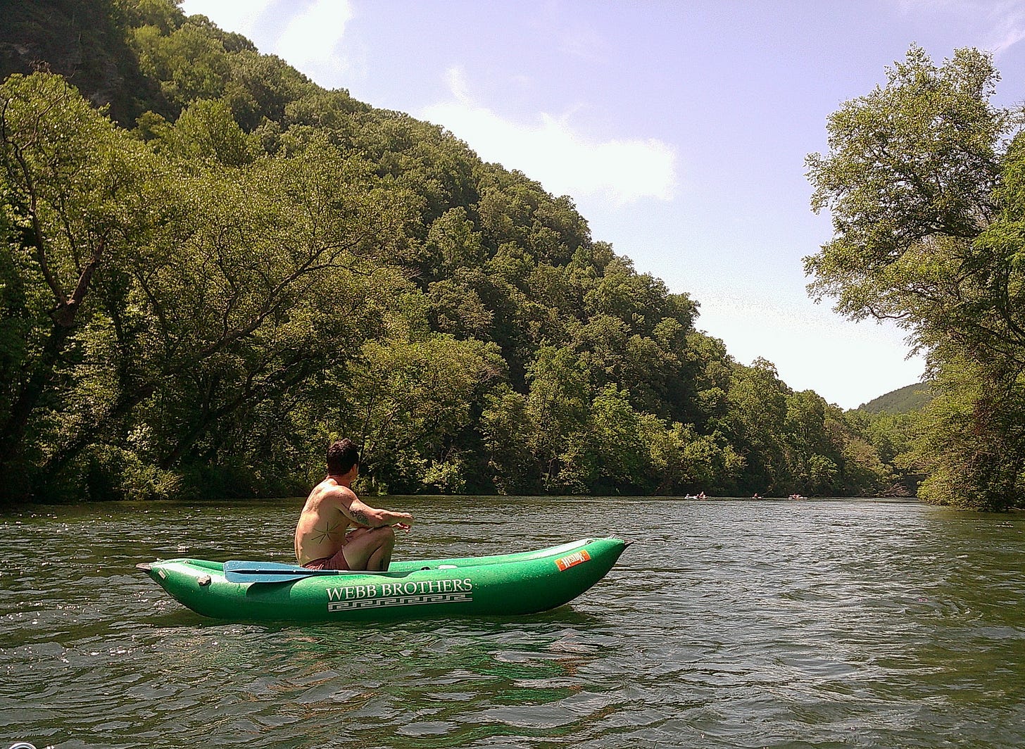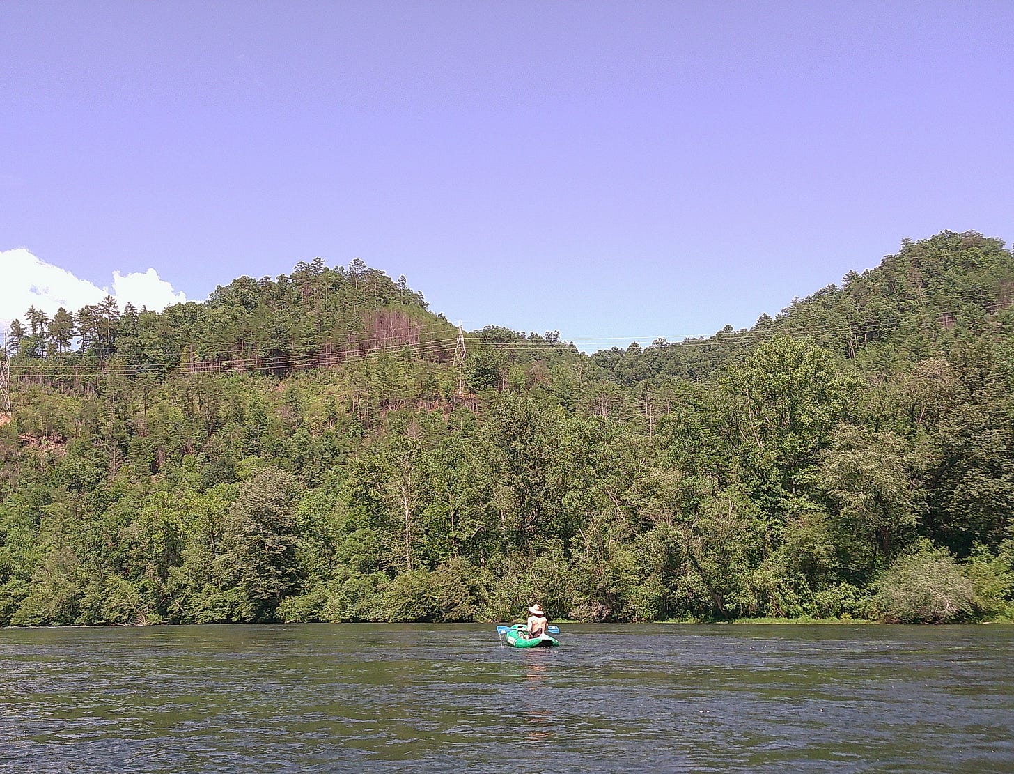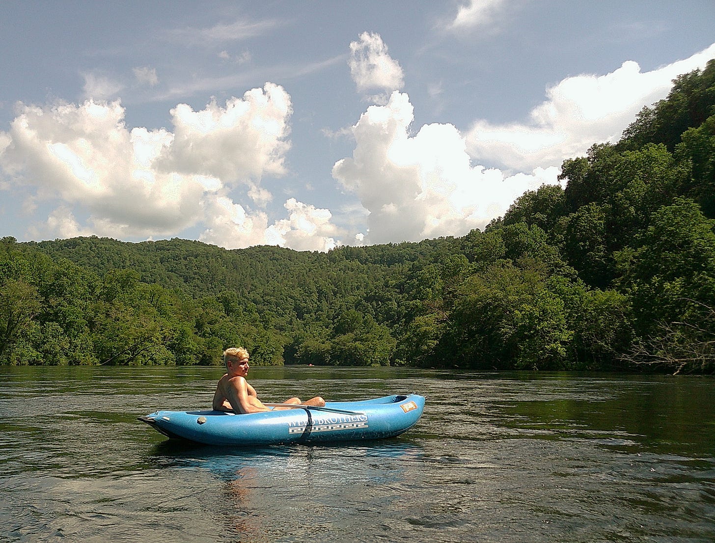 We kayaked the Hiwassee last weekend. I love any excuse to get in the water, and it’s a perfect blend of activity and leisure. About half the time you can just lie back in your raft and let the river take you, but every so often you hear the trickle of a small rapid ahead. None of them are scary, but you’ve got to paddle and steer a little or your kayak might get stuck. We bring beers even though you’re not supposed to.
